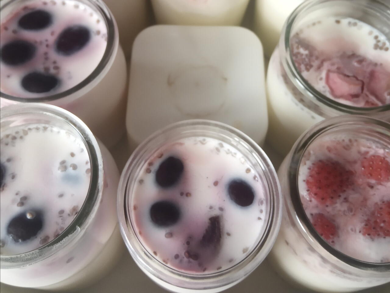 Mettre les fruits et les graines de chia dans le pot et ajoutez la préparation.
