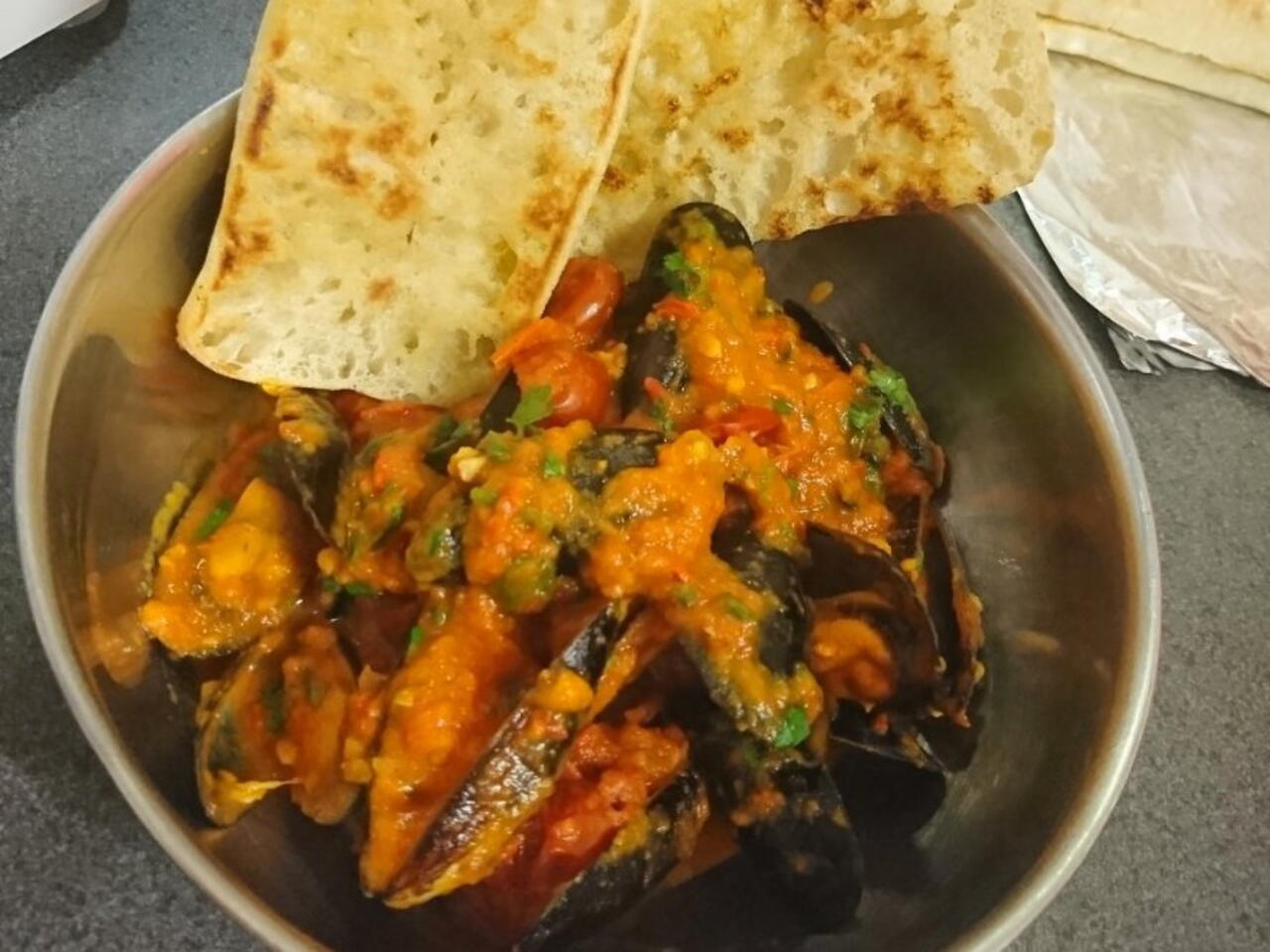 Return to heat and add mussels and tomatoes. Season with black pepper simmer for 15 minutes