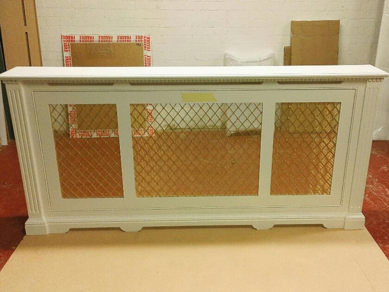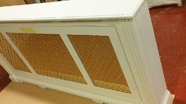 A radiator cover made from maple and golden wired grill. Primed by spraying AC white primer.