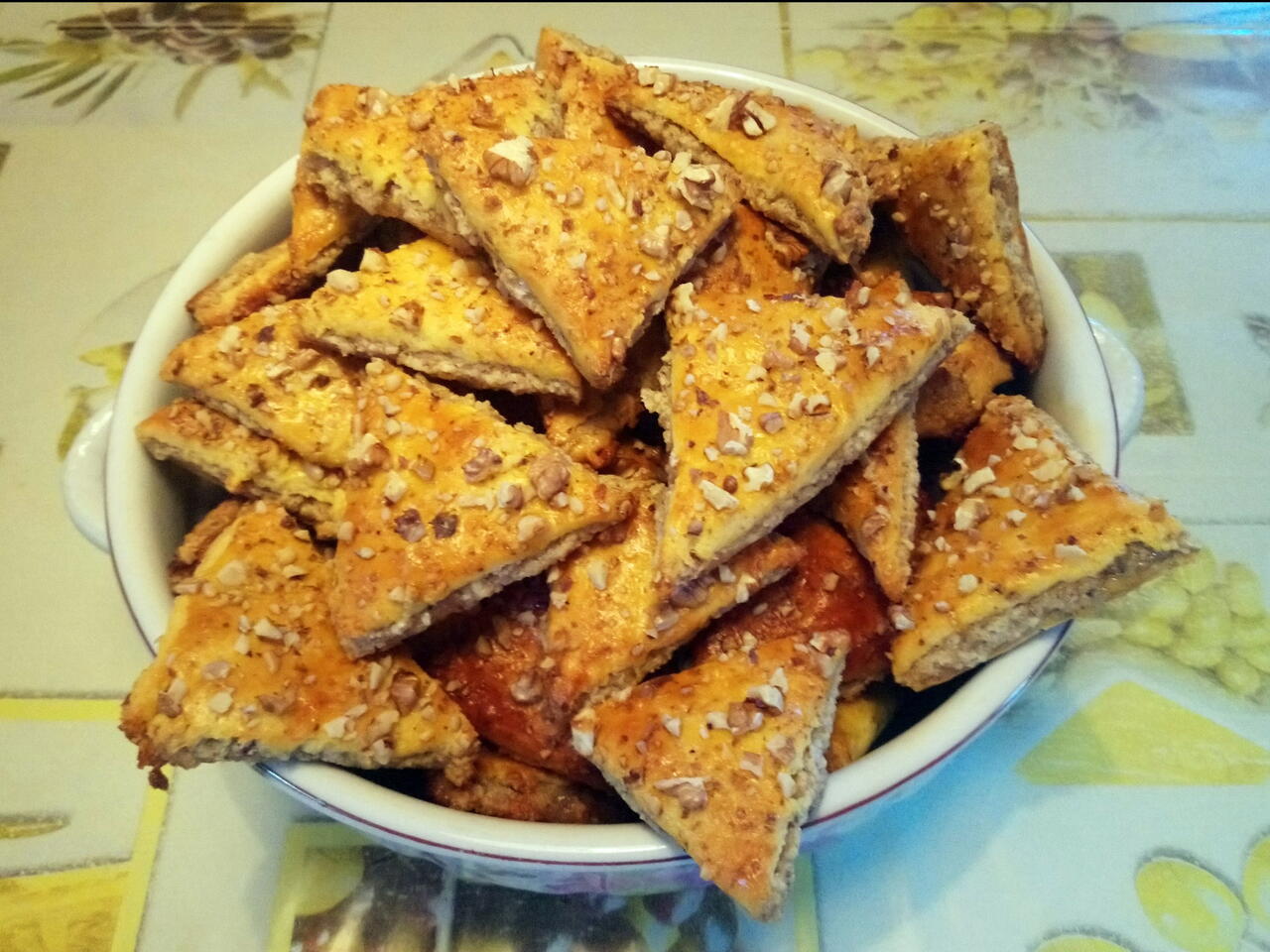 Az egészet összegyúrni, 2 részre osztani, kisodorni. Az alsó lapot megkenni lekvárral (barack), majd rá a töltelék: 30 dkg dió, 30 dkg porcukor, 3 felvert tojásfehérje, 1 db citrom reszelt héja - mindezt óvatosan összekeverni majd a lapra kenni. A másik kinyújtott lappal betakarjuk, tetejét megkenjük tojással, megszórjuk vagdalt dióval, majd háromszögekre vagdaljuk és megsütjük. (Sokáig eláll)!