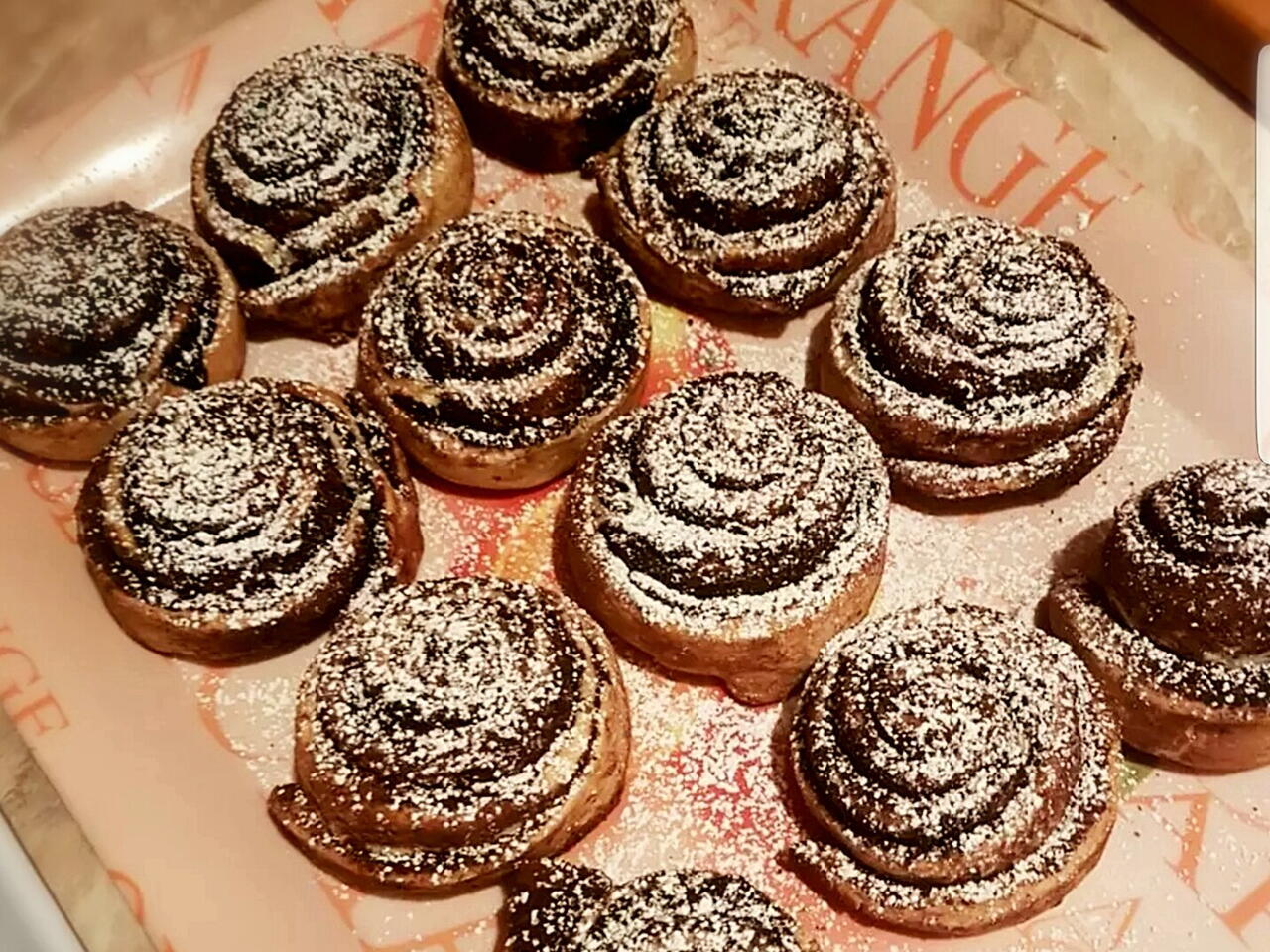A tésztát lekenjük az olvasztott vajjal. Rászórjuk a kakaós cukrot. Majd a maradék vajjal lelocsoljuk. Nem baj, ha nem kerül minden hova.