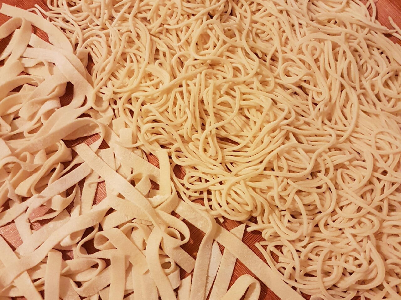 A tésztát nyújtsa ki a 3-as fokozaton, majd a szélesmetélt-vágon tekerje át, és darabolja fel metélt szálakra.