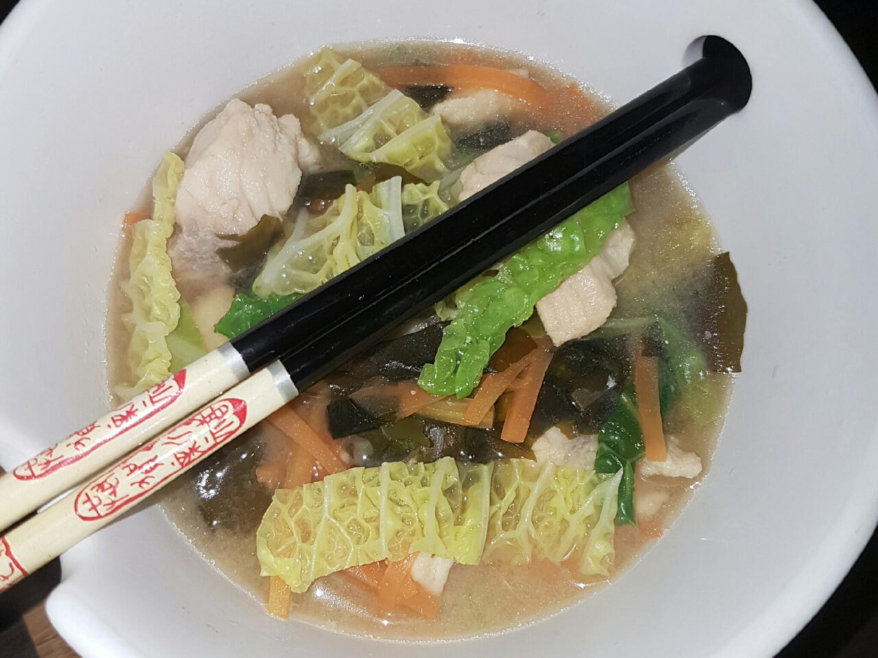 A miso pasta, a sárgarépa csíkok, a kelkáposzta csíkok, a hal filé.