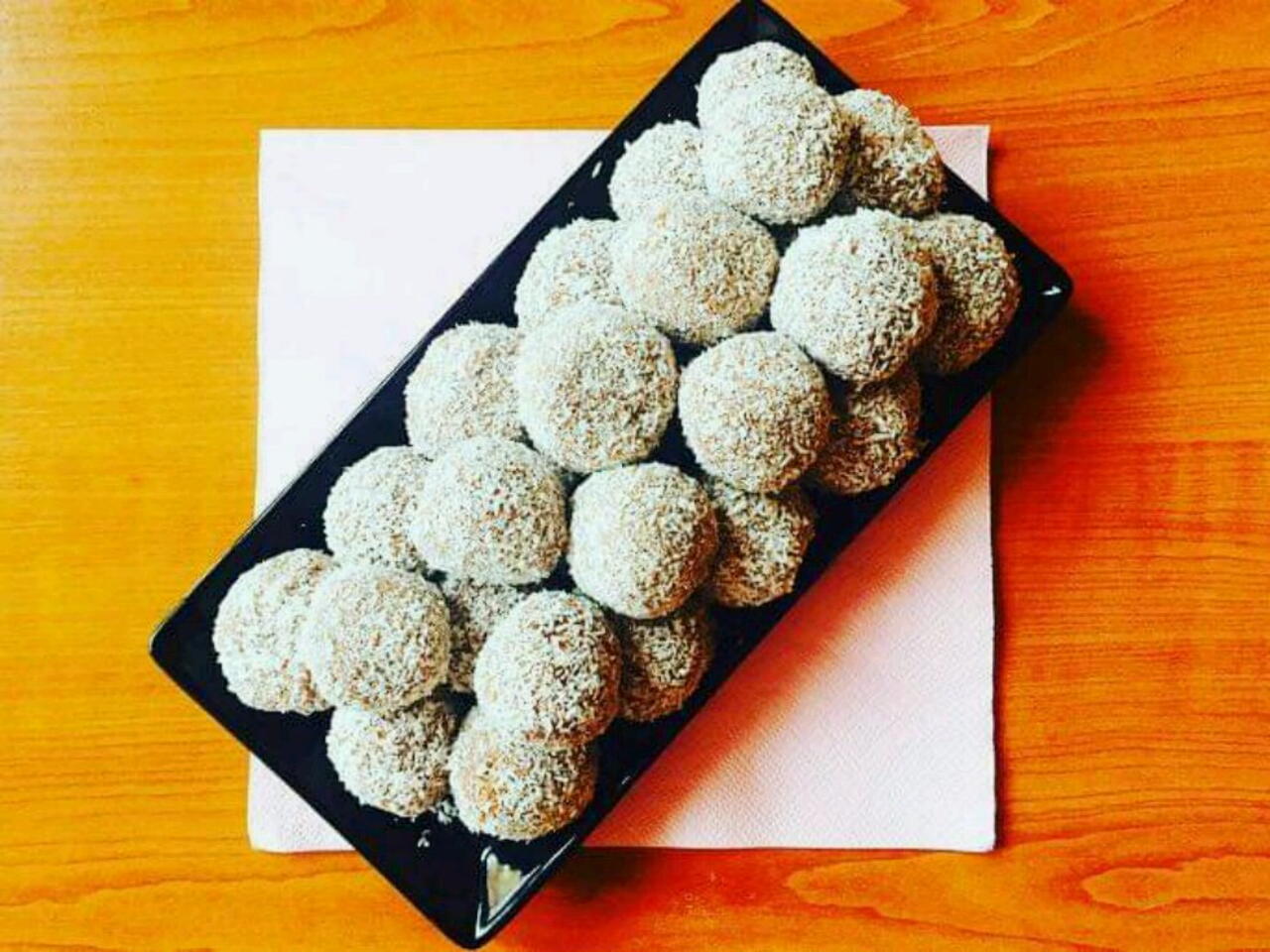 Nedves kézzel gombócokat formálunk belőle, amit kókuszreszelékbe forgatunk.