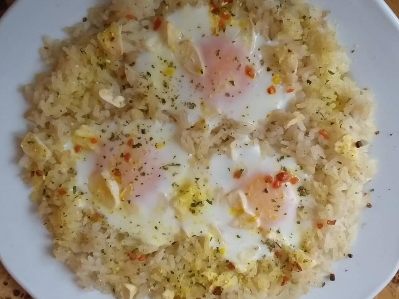 A rizst előfőzzük.Ha kész a rizs,tányérra szedjük és ráütünk fejenként 3-tojást.Fűszerezzük és rászórjuk a felszeletelt fokhagymát, majd grill sütőben 5-10-pecig hőkezeljük! Jó étvágyat! 🍛