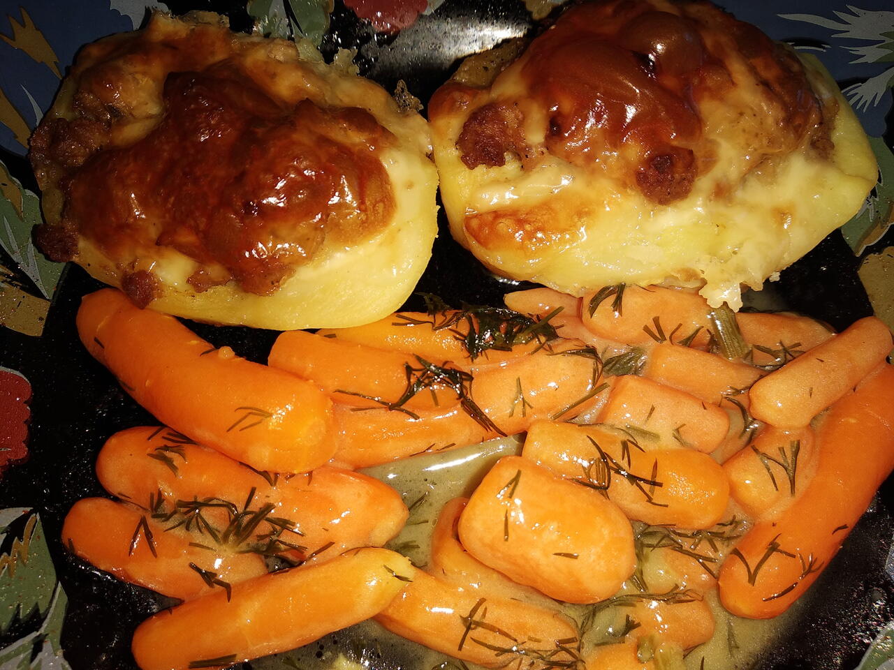 Megpucoljuk félbe vágjuk a burgonyát, sós vízben félig megfőzzük. Közben megpiritjuk a hagymát és a húst fűszerezzük. Mindent kicsit hűlni hagyunk. Kibelezzük a burgonyát. A húshoz egy tojást keverünk. És megtöltjük a burgonyàkat. Amit tepsibe teszünk előzőleg megsózzuk olajozzuk. Tetejére kerül a sajt. Sütőben 200fokon 25 sütjük. A répát 5 percig főzzük,majd olvasztott vajba dobjuk, rá kerül a só és méz majd a kapor. 10 percig lassú tűzön főzzük. Jó étvágyat 😊