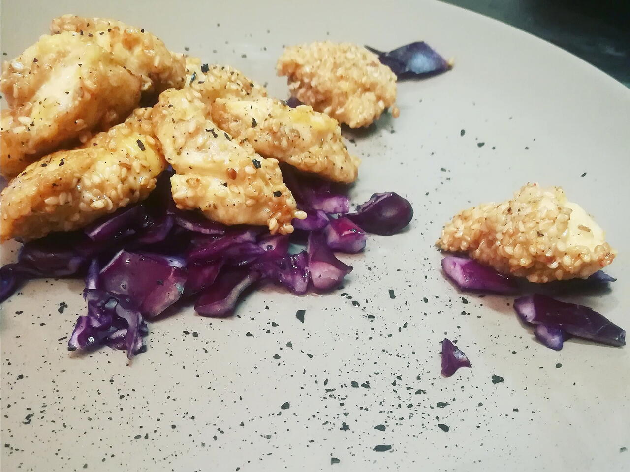 Bocconcini di Pollo Al Sesamo Fritti Con Cavolo Viola