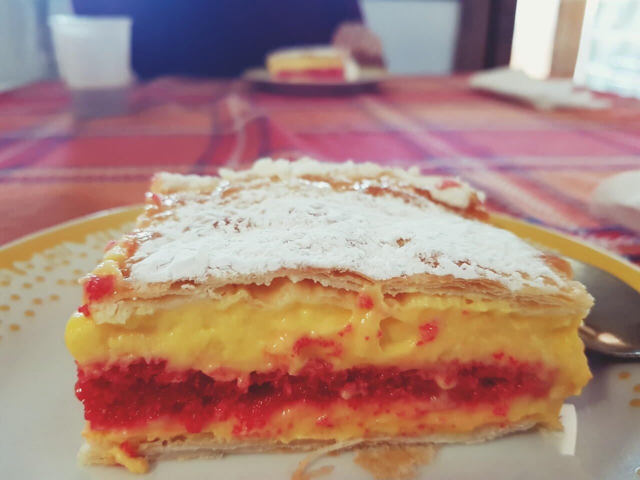 Mettere su un piatto la sfoglia , mettere la crema diplomatica e sopra le fettine di pan di Spagna, bagnarle con alchermes diluito e rimette sopra la crema chiudere il tutto con l ultima sfoglia e spolverizzate con zucchero a velo