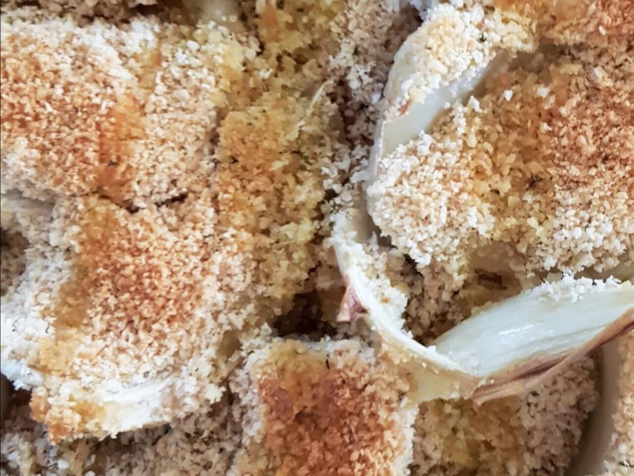 Cospargere i Finocchi con il trito, aggiungere un po' di olio ed infornare a 150Β° per 20 min.