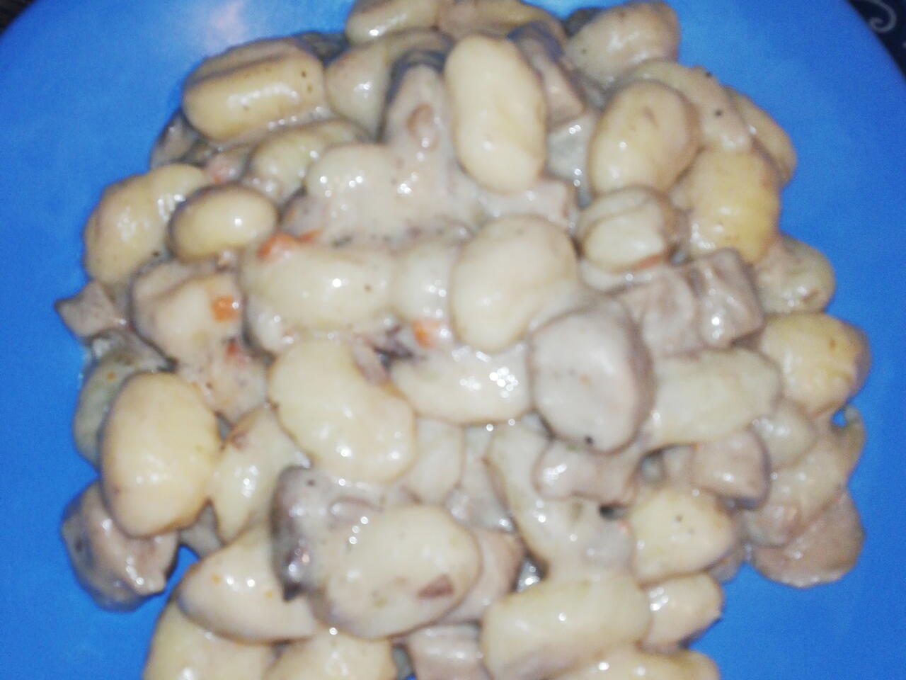 In una padella soffriggete la salsiccia con aglio e i funghi. Nel frattempo cominciate a bollire l'acqua per gli gnocchi a fuoco lento.