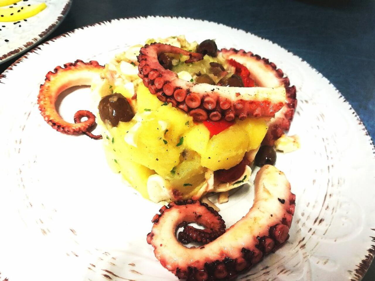 Quando il Polipo è bello morbido (assaggiarlo perché il tempo di cottura varia dalla dimensione del Polipo e della pentola) tagliare i tentacoli del Polipo e piastrarli con molto calore da una parte e dall'altra (20/25s per lato)