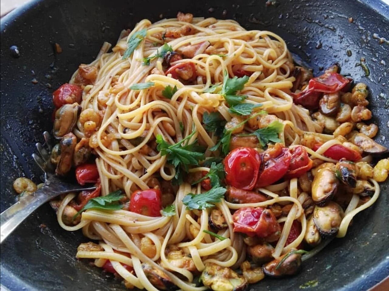 A fine cottura delle linguine ripassare in padella e aggiungete un mestolo di acqua cottura pasta.