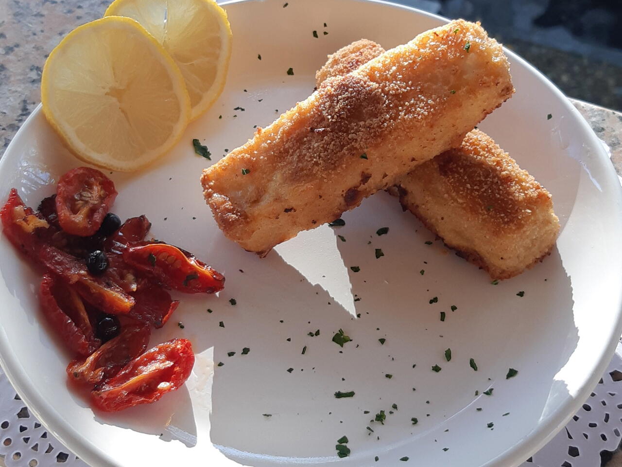 Prendere i filetti di merluzzo, passare prima nel uovo e dopo nel pangrattato.
