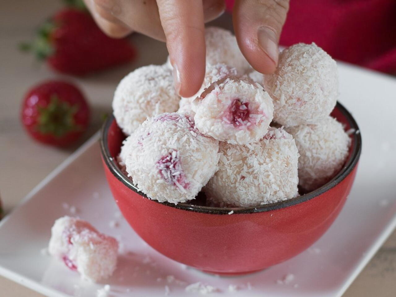 Prendi con il cucchiaino un po' di impasto per volta e forma le palline di cocco con le mani, devono essere un pò più piccole di una noce.