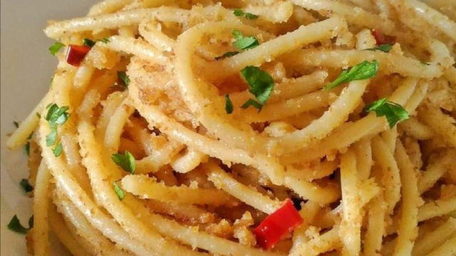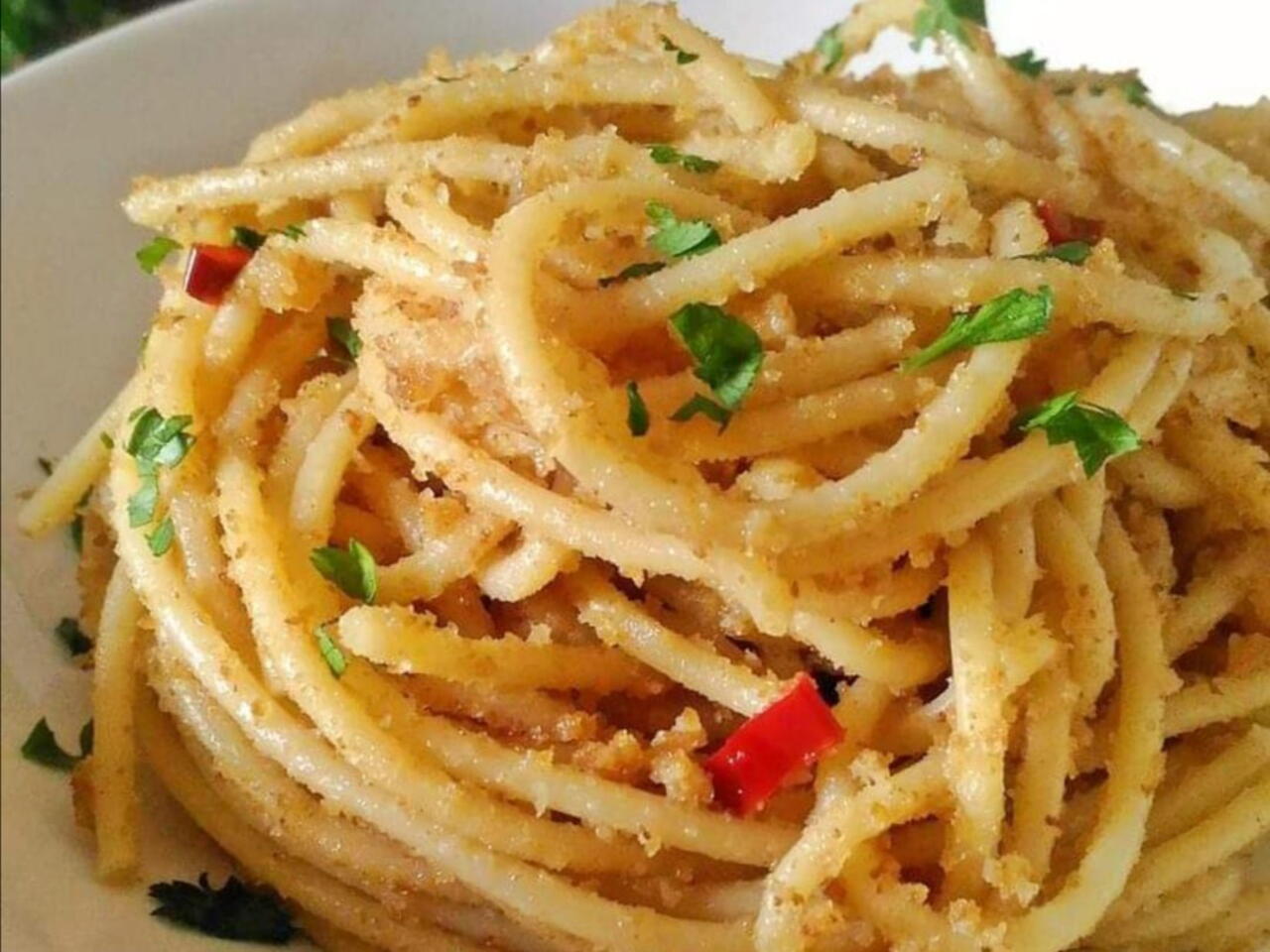 Fare tostare il pan grattato con olio e peperoncino almeno per 5 minuti il tempo che il pan grattato diventa un po scuro. Scolare la pasta e metterla nella padella dove c'Γ¨ il pan grattato mescolate il tutto aggiungendo il prezzemolo tagliato finemente e servire.