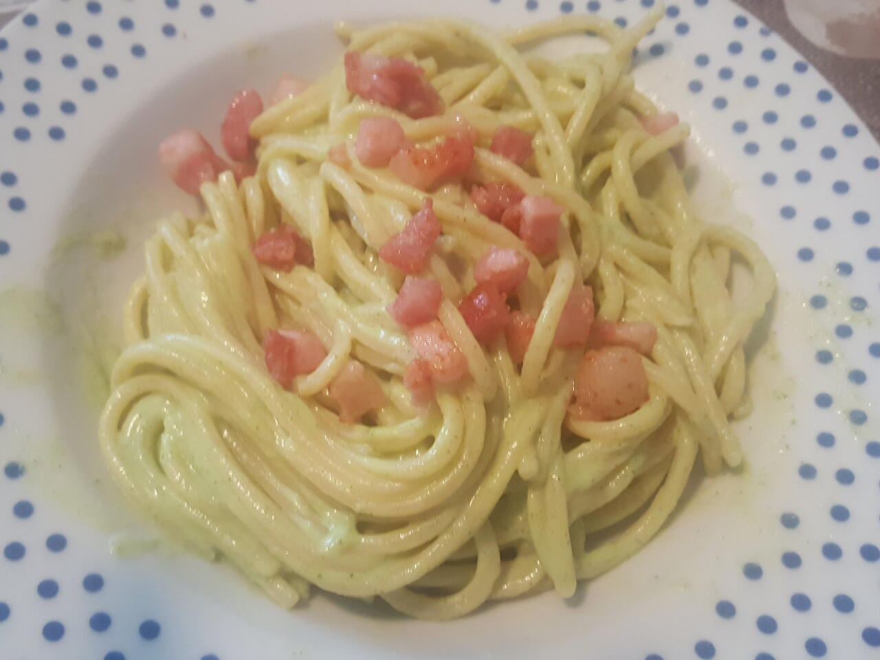 Mettere a bollire l'acqua per la pasta, una volta cotta la Pasta, mantecare gli spaghetti con la crema di zucchine e la pancetta