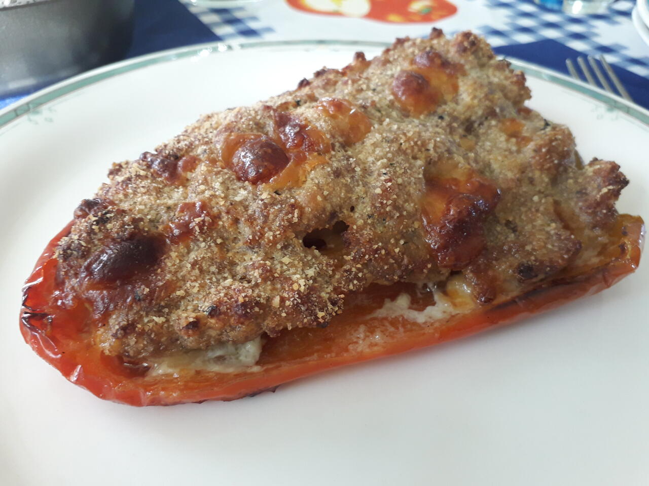 Tagliare in due i peperoni e adagiarli su una teglia antiaderente. Saporirli con un po' di sale ed olio, aggiungere l'impasto e schiacciarlo bene. Dare una spolverata di pan grattato e un filo d'olio. Aggiungere un bicchiere d'acqua nella teglia e infornare a 170Β° per 30 min. Serviteli caldi.
