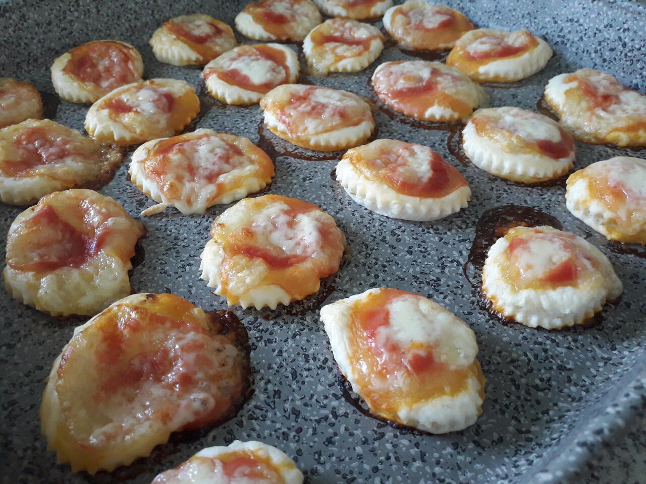 Metterli in una teglia anti aderente, su ogni cerchio mettere un cucchiaino di passato di pomodoro e cubetti di mozzarella. Infornare nel forno giร caldo a 170ยฐ per 10 minuti. Servire caldo o freddo.