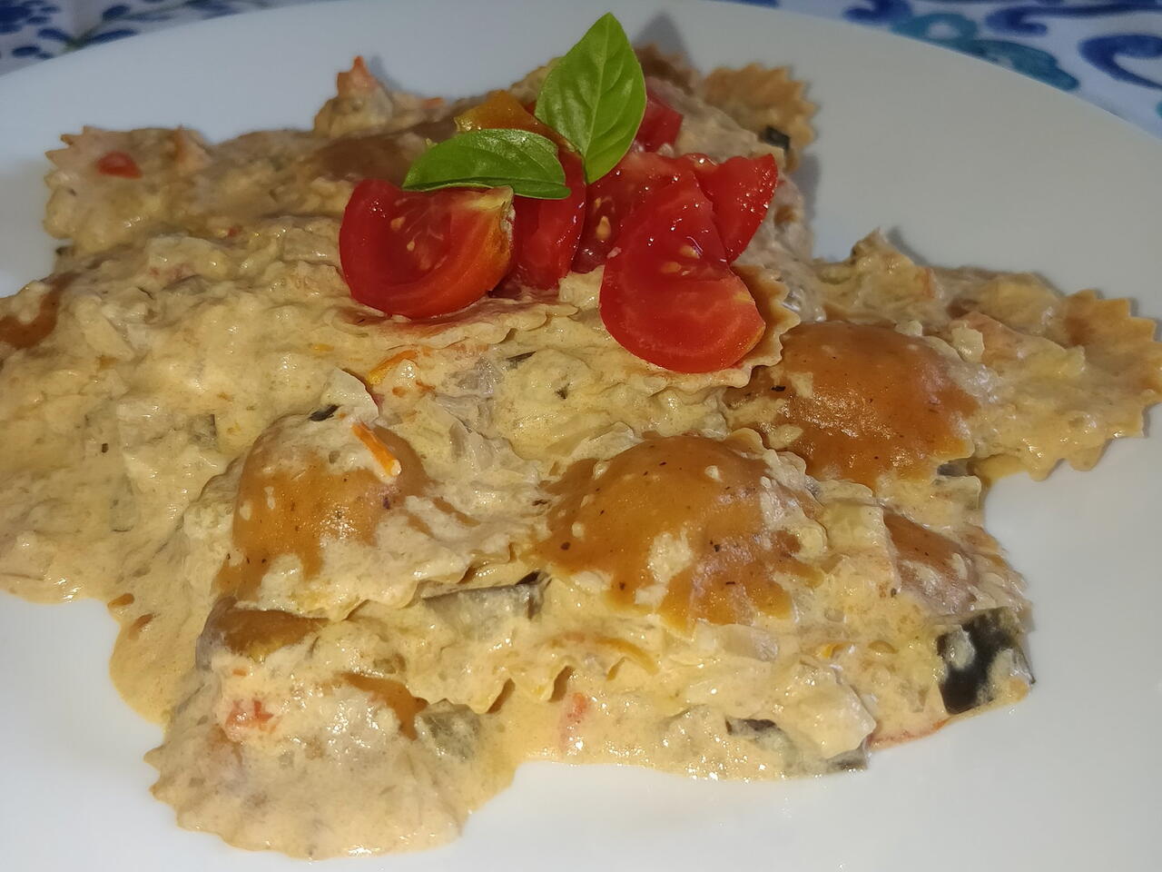 Successivamente aggiungere funghi e pomodorini e far rosolare per almeno 5 minuti, aggiungere poi mezzo bicchiere d'acqua, sale e lasciar cuocere per 10 15 minuti.
