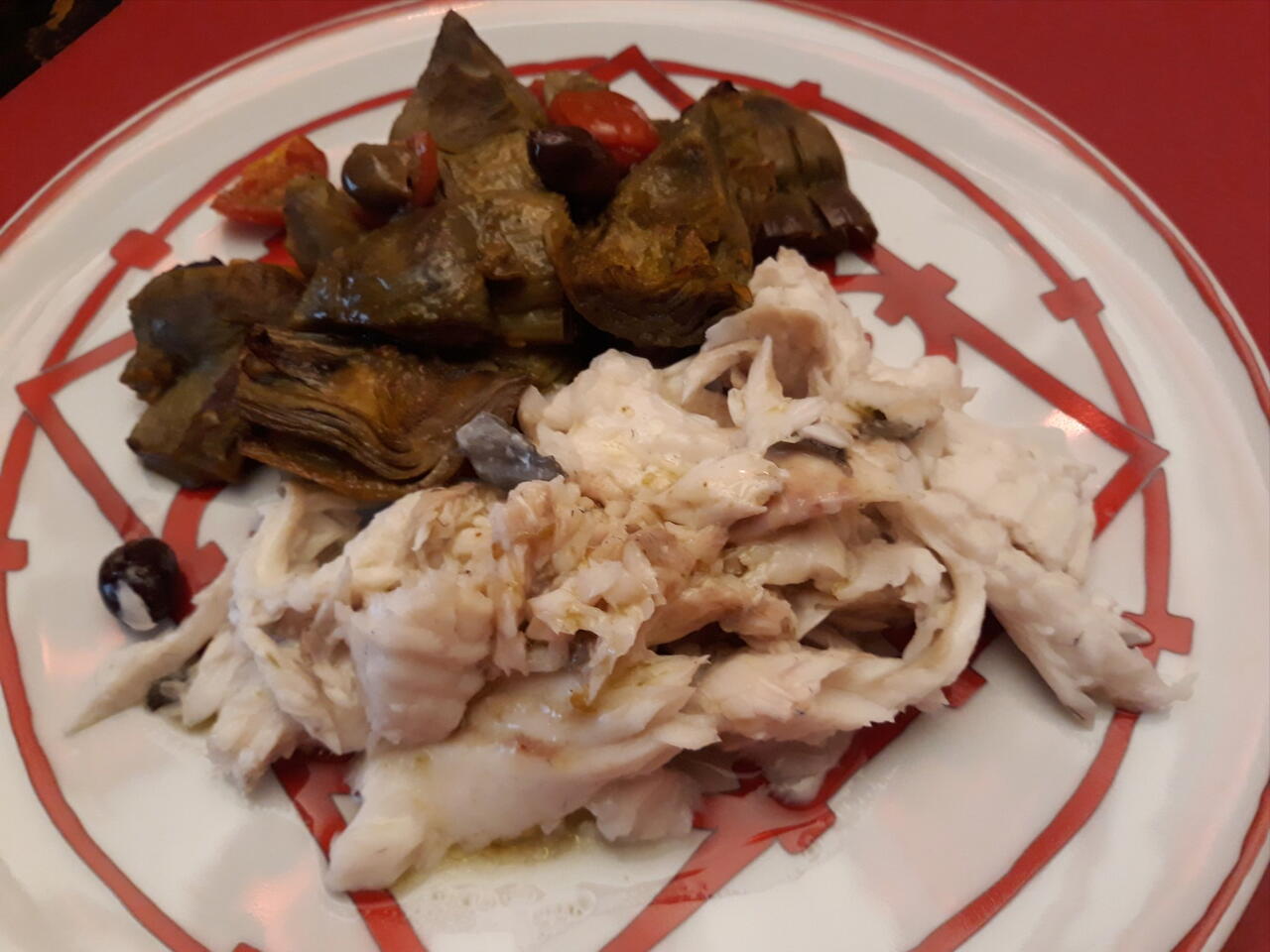 lavare il rombo. metterlo in placca con la carta da forno e coprire con carciofi. cuocere al fino caldo per 30-40min a 180°C