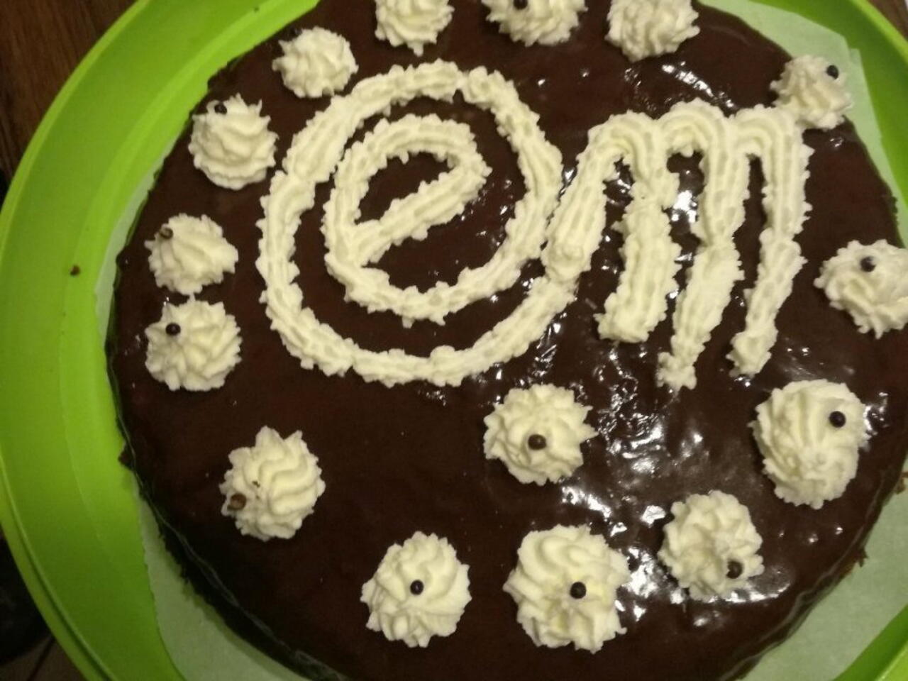 Tolta dal frigo non resta che decorarla(se si vuole). Io ad esempio, ho montato la panna avanzata, ho firmato il mio dolce e poi ho fatto dei decori intorno.