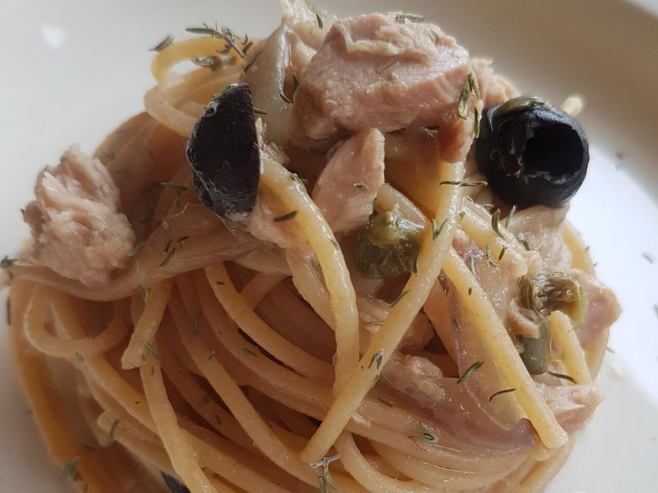 Aggiungere il tonno a pezzettini e fai cuocere x altri 3-4 min. Fai saltare a fuoco vivace. Aggiungere la pasta con del acqua di cottura e fai saltare. Condire con del Timo