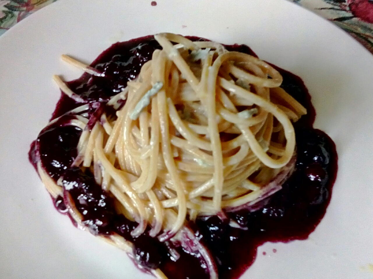 Spaghetti Quadrati di Farro Con Zola Piccante e Mirtilli