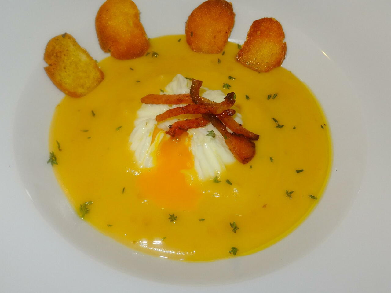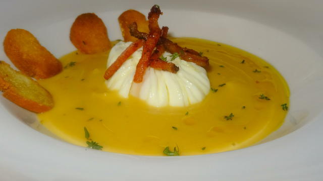 Uovo in Camicia Su Macco di Fave e Guanciale Croccante
