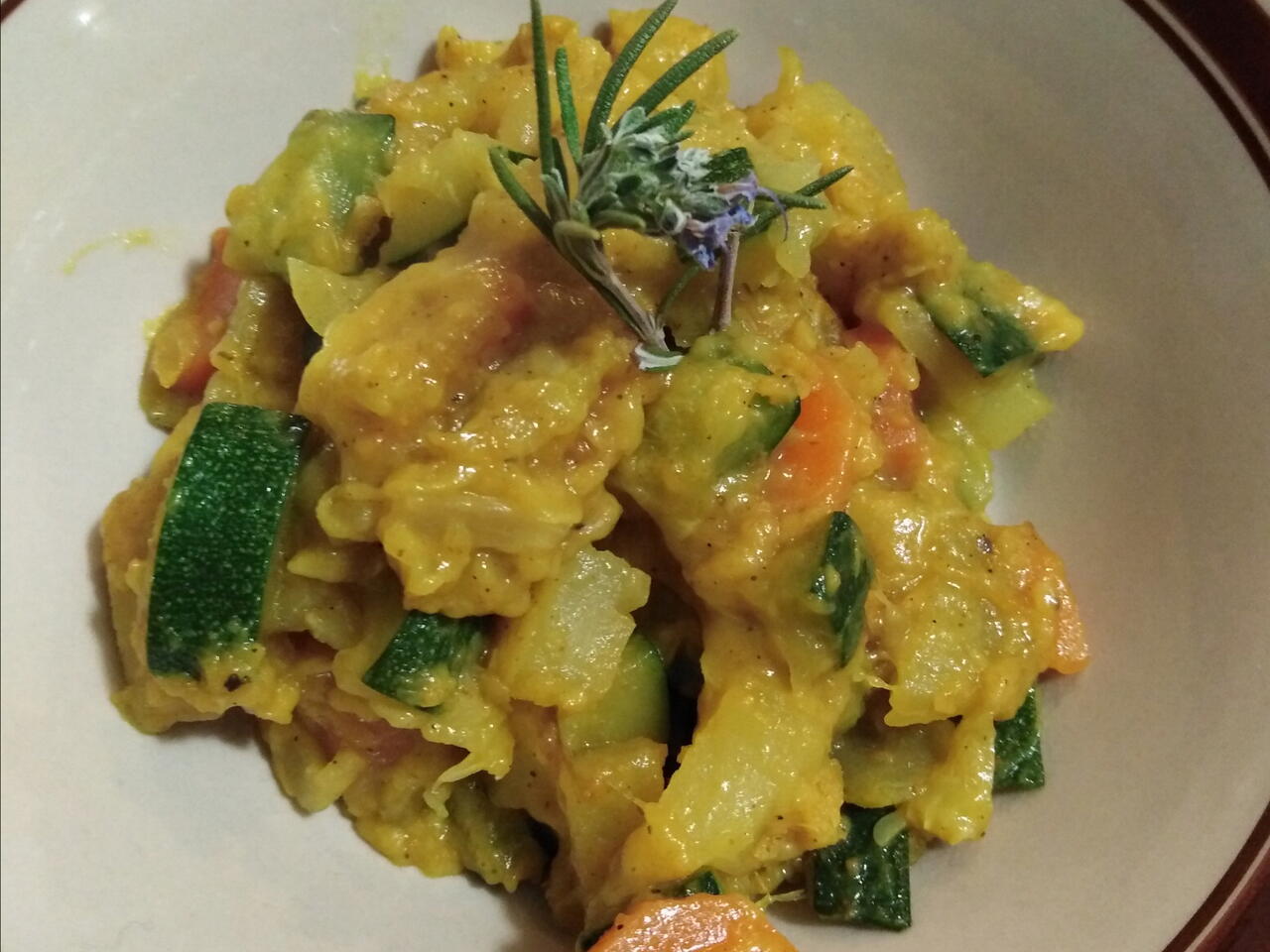 Aggiungere mezzo dado è un rametto di rosmarino. Coprire con un coperchio e cuocere a fuoco vivace fino alla cottura delle verdure (circa 20 minuti). Dopodiché con l'acqua rimasta nella padella creare la salsina al curry aggiungendo curry e pepe a piacere farina qb per addensare.