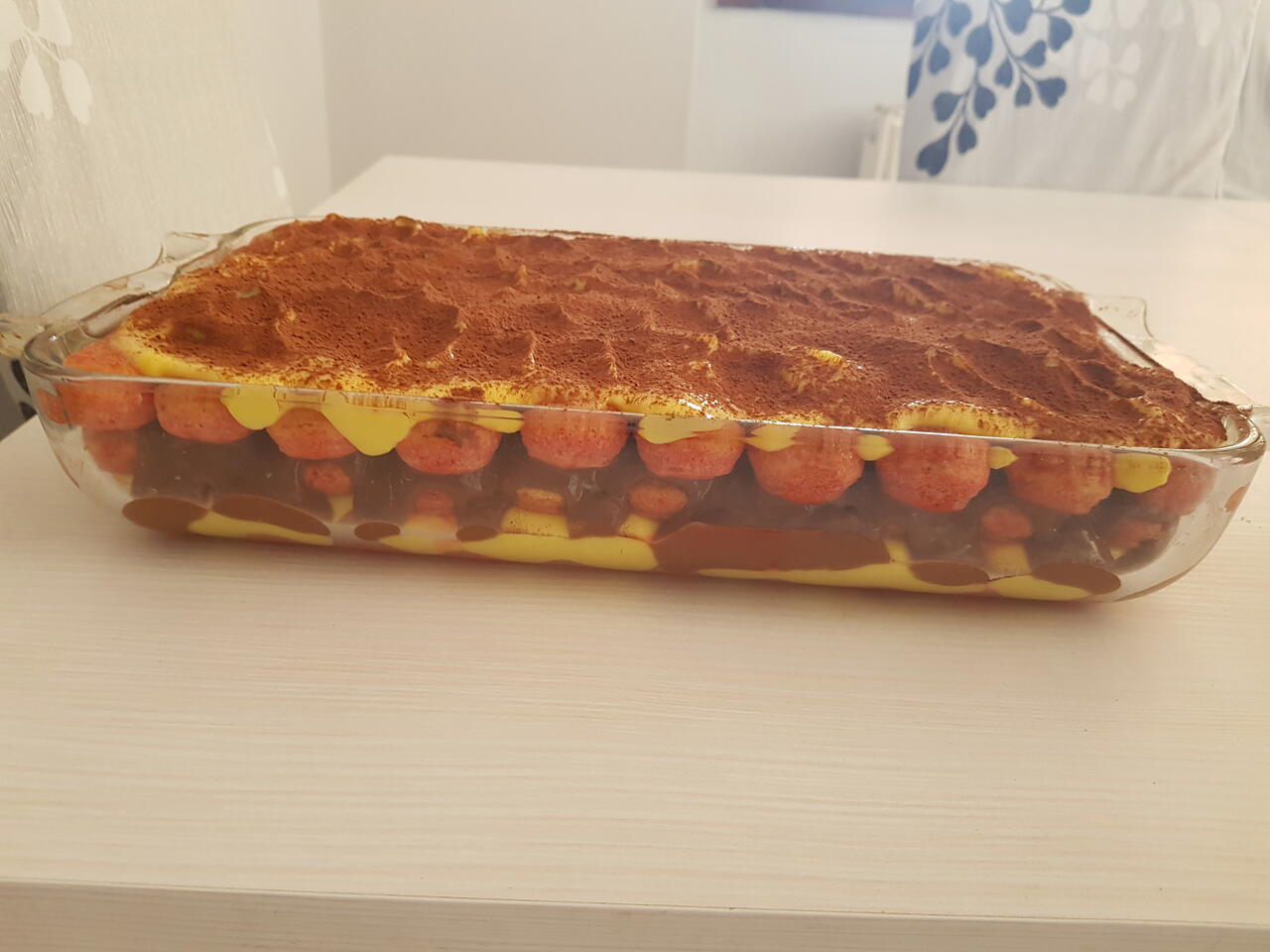 Immergete velocemente i savoiardi nella bagna, su entrambi i lati, in modo da colorarli senza inzupparli troppo. Mettere uno strato di crema sopra ai biscotti. Mettere altri savoiardi sopra la crema e ricoprirli con la crema al cacao, mettere l ultimo strato di biscotti e crema e spolverizzare con il cacao