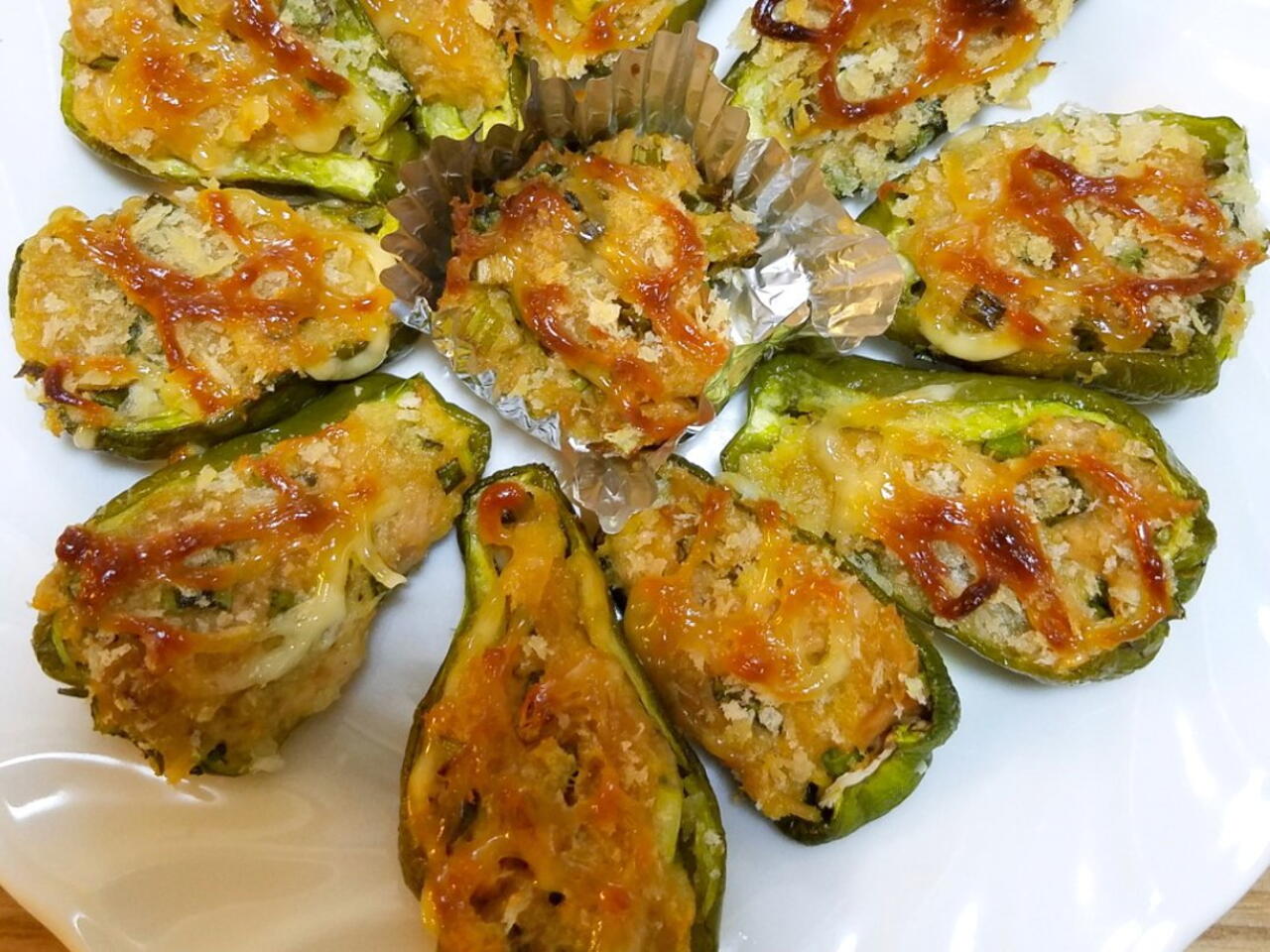 ピーマンに上の中身をきっちり詰める。上にパン粉を散らしマヨネーズをかける。