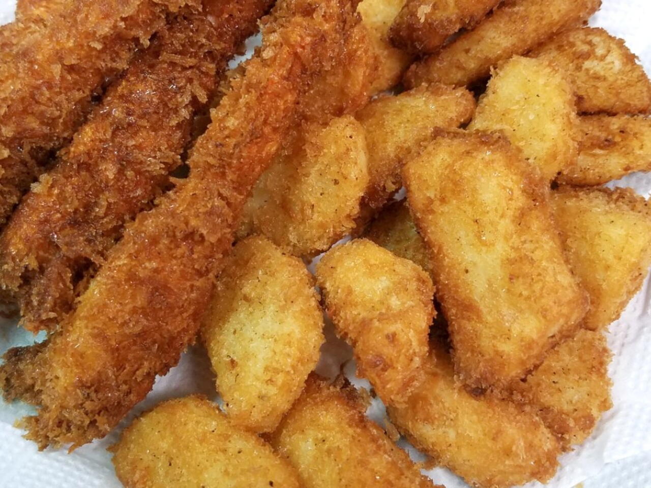 180℃油でこんがり色が付くまで揚げる。カツや海老フライのお供に☝️ケチャップが合います❗