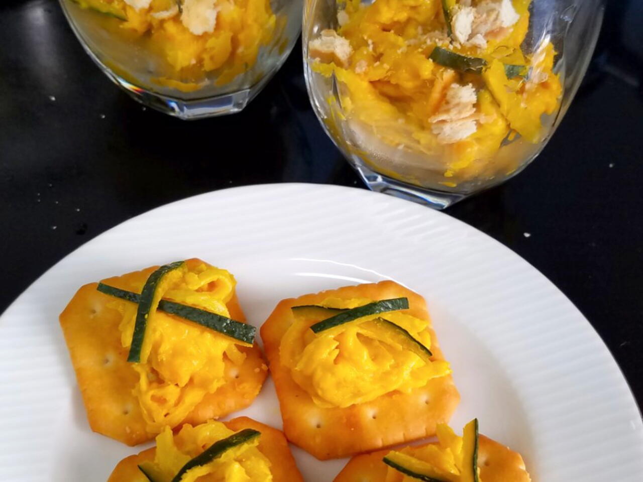 ガラス器に盛り、細切りのカボチャの皮と砕いたクラッカーをトッピング(^^)dクラッカーに盛り付けカナッペとしても☝️