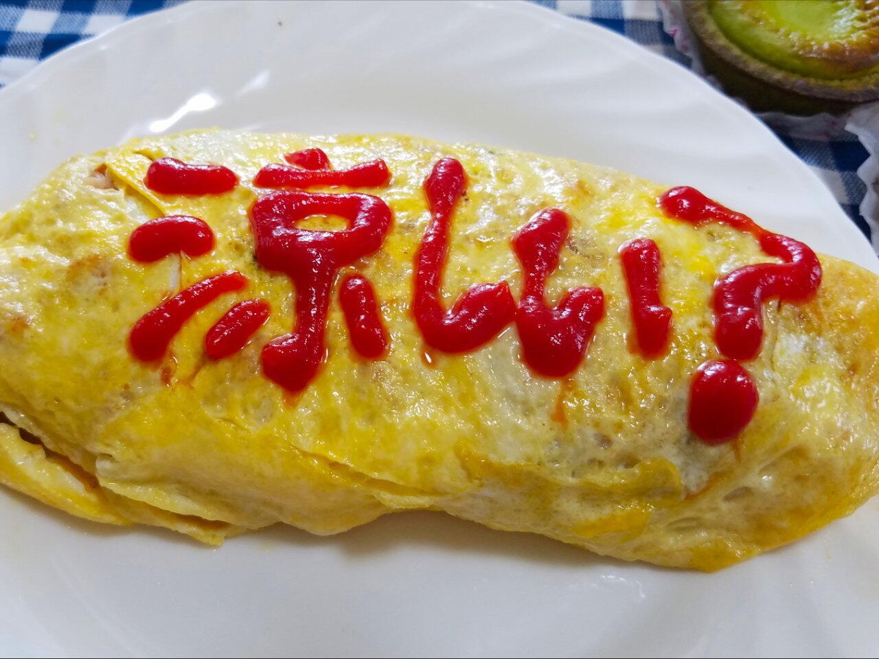 卵1.5~2個を溶いてバターを熱したフライパンで薄焼き卵を焼く。周りが乾いて来たら形を整えたチキンライスをのせる。