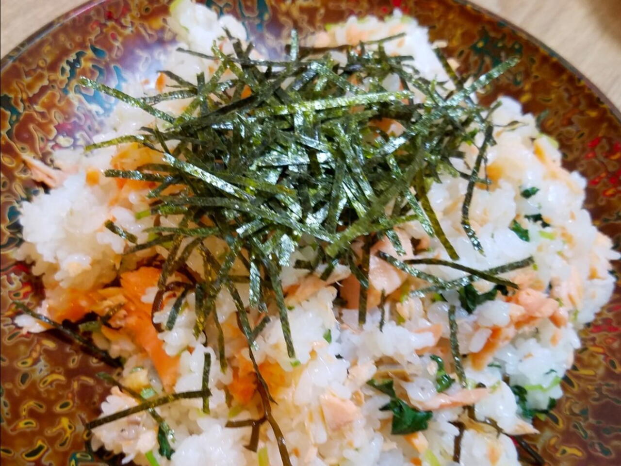 酢飯に鮭、三つ葉、塩昆布大さじ2混ぜる。
