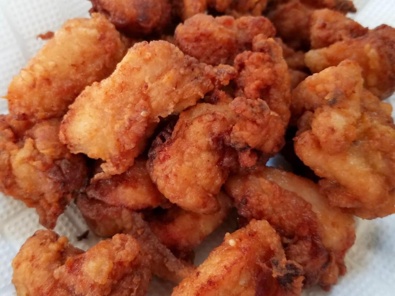 油の温度を200℃に上げて、15~20秒位揚げる。二度揚げすることで外はかりっと中はジューシーに(^^)d