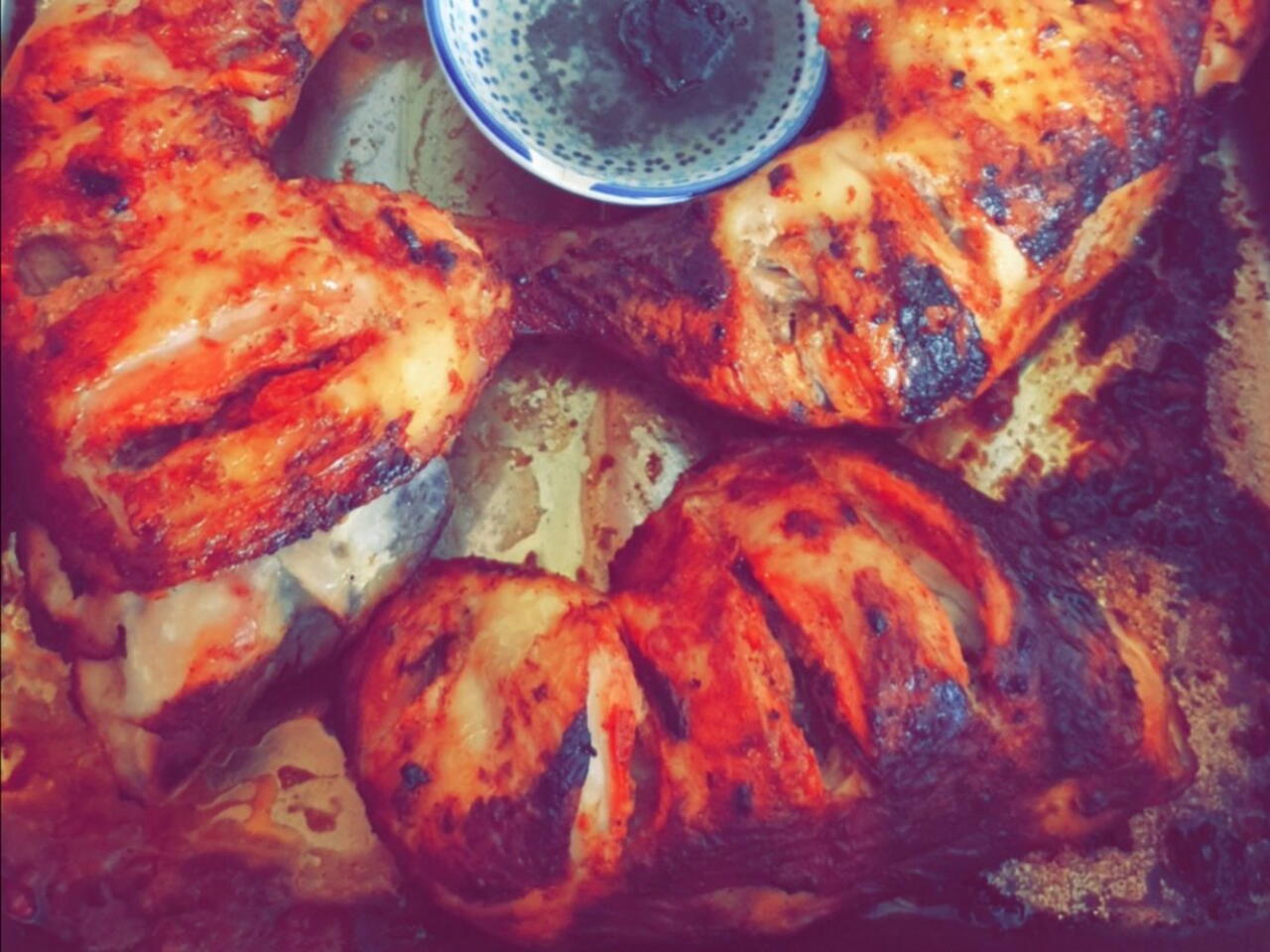 Snij de kippenbouten diep in aan beide kanten. En wrijf ze in met de gekleurde yoghurt marinade. Dek het af en zet het in de koelkast voor minimaal 10 uur (liefst een dag)