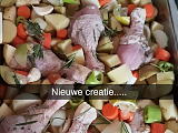 Leg de kip tussen de aardappelblokjes, geef de hele tenen knoflook in schil ook een plaatsje. Voeg alles wat nog in de kom zit aan kruiden en marinade erbij. Ik heb er ook nog een in ringen gesneden ui aan toegevoegd.