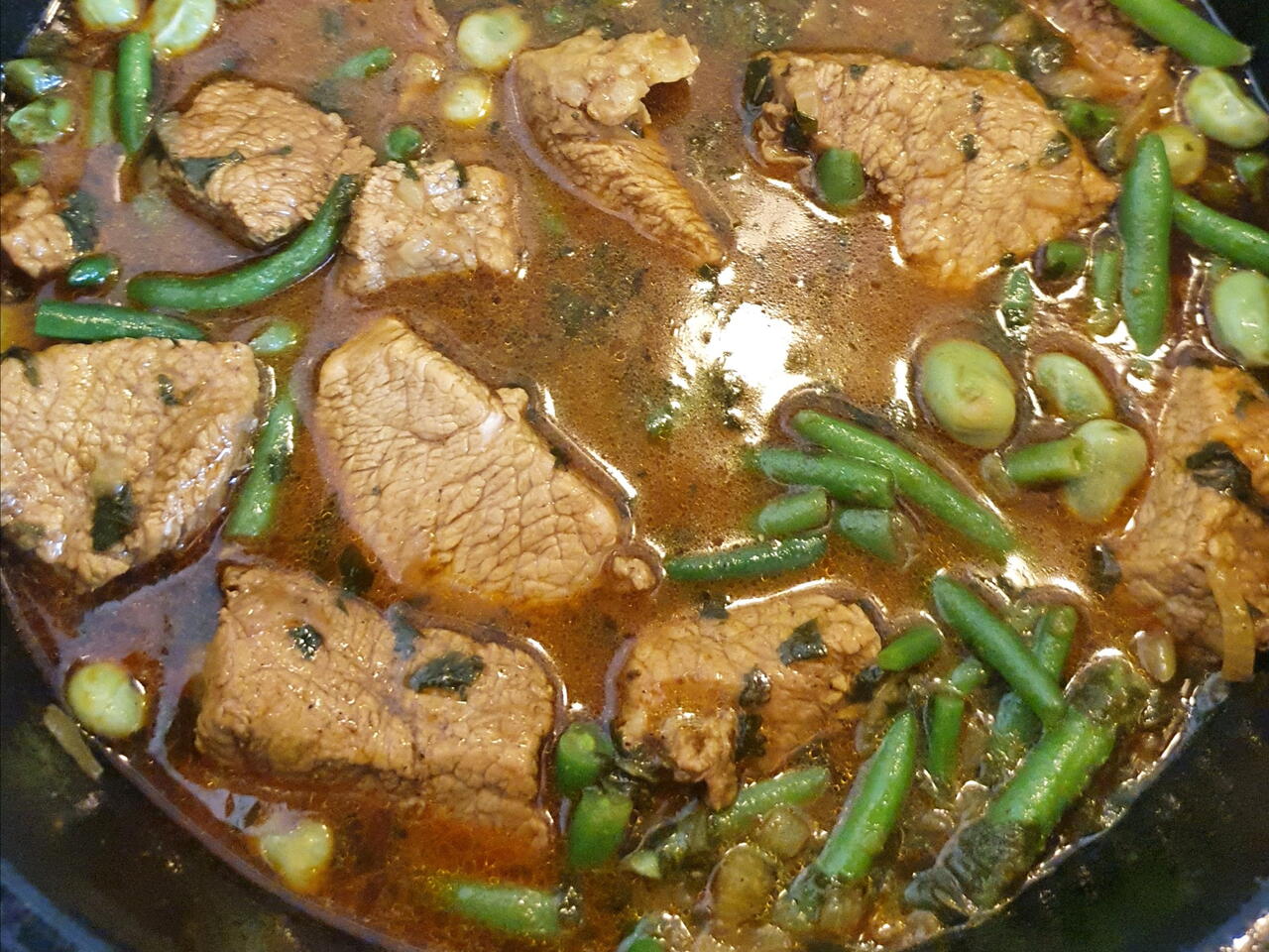 Doe heet water erbij zodat het vlees net niet onder water komt, laat het koken, delsel op de pan en voor 45 minuten laten stoven. Schep de tuin en sperziebonen erdoor de citroenstukjes of het sap erbij, breng aan de kook en laat het in 15 tot 20 minuten garen.