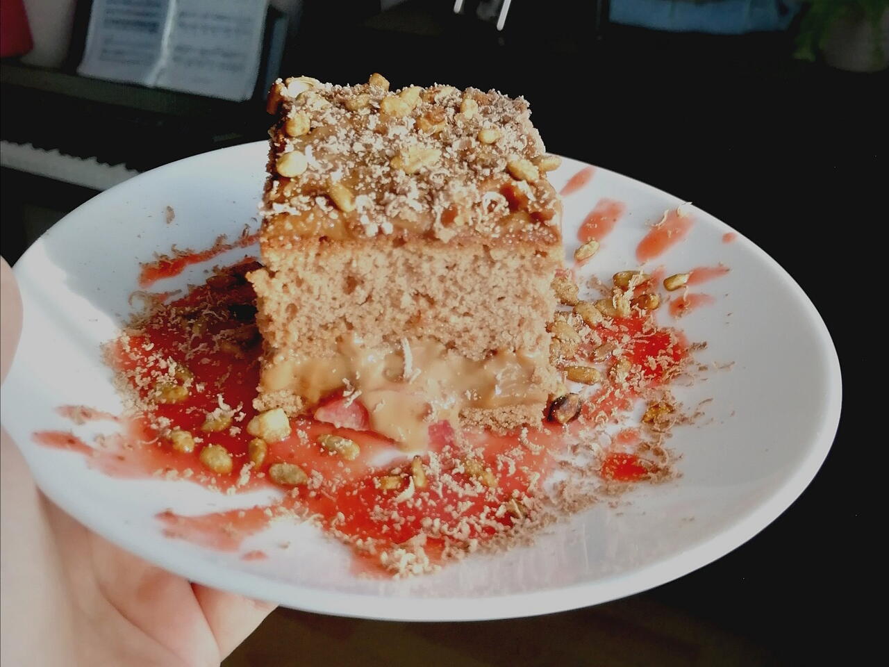 Po upieczeniu ciasto przekrój wzdłuż i posmaruj spód masą krowkową (opcjonalnie wymieszaną z masłem orzechowym/nutellą) zostawiając trochę na posmarowanie wierzchu.