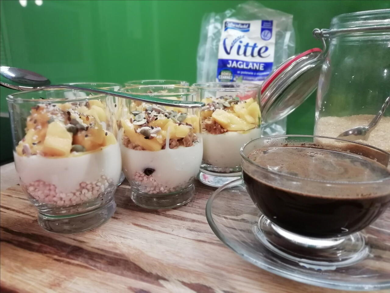 Nasypujemy kaszę ekspandowaną, gotujemy budyń ( może być bez cukru, smak wybierz sam 😉 ja dałam biszkoptowy z łyżką czubatą cukru trzcinowego ) , kruszy się po jednym ciasteczku zbożowym belvita, kroi dojrzałe mango ( lub Twój ulubiony owoc ) , posypujemy ziarenkami. Wrzucamy do lodówki i po godzinie robimy sobie kawkę. Smacznego łasuszku .