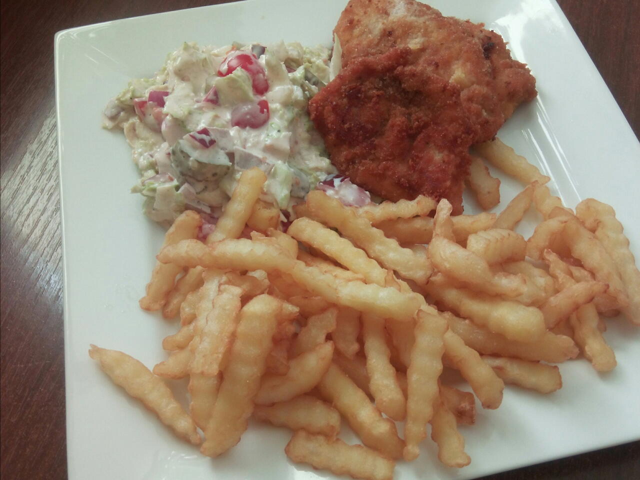 Pierś z kurczaka dokładnie umyć.Pokroić w paski.Delikatnie stłuc. Doprawić solą ,pieprzem oraz curry.Wymoczyć w jajku i bułce tartej . Na rozgrzaną patelnie kładziemy nasze kotleciki . SAŁATKA: Zmielić czosnek.Wszystkie warzywa pokroić w drobną kostkę.Wrzucić do miski i dodać majaonez ,musztardę i doprawić solą i pieprzem. SMACZNEGO!