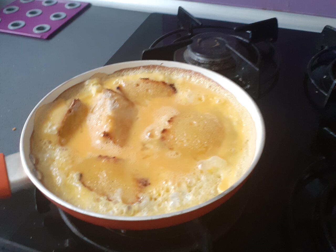 Kiedy będzie z jednej strony przypieczony polewamy chleb naszym płynem z jajek