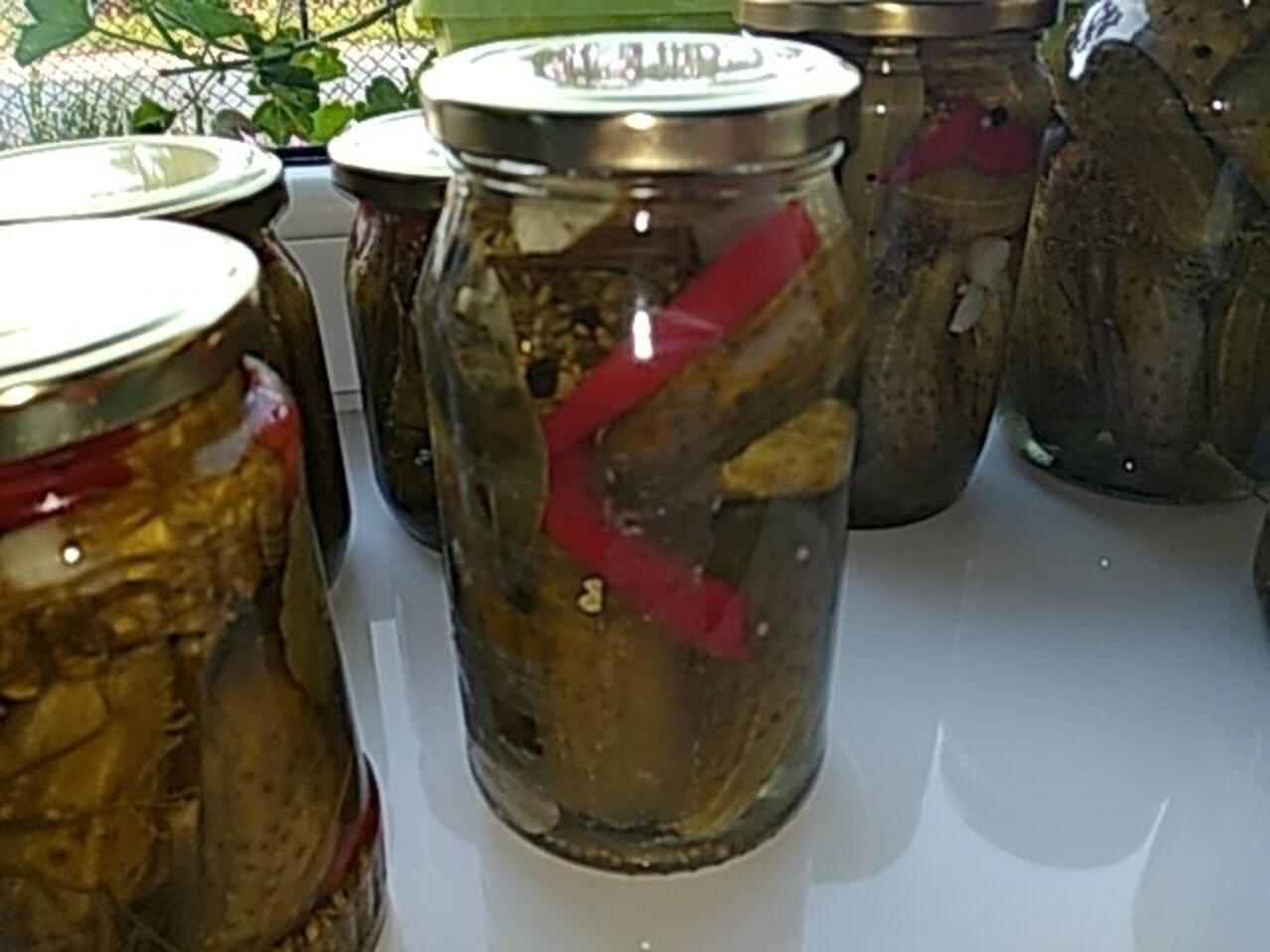 Na dno każdego słoika wrzucamy 6 plasterków marchewki,kilka gałązek kopru, 3 ziarna ziela angielskiego, liść laurowy, ząbek czosnku, kilka kawałków świeżego Chrzanu, 6 ziaren czarnego pieprzu, kilka ziarenek gorczycy. Ogórki wkładamy do słoików (do oporu). Wszystkie składniki zalewamy i mieszamy , zagotowujemy i zalewamy ogórki. Słoiki zakręcamy i układamy na zakrętach do ostygnięcia.
