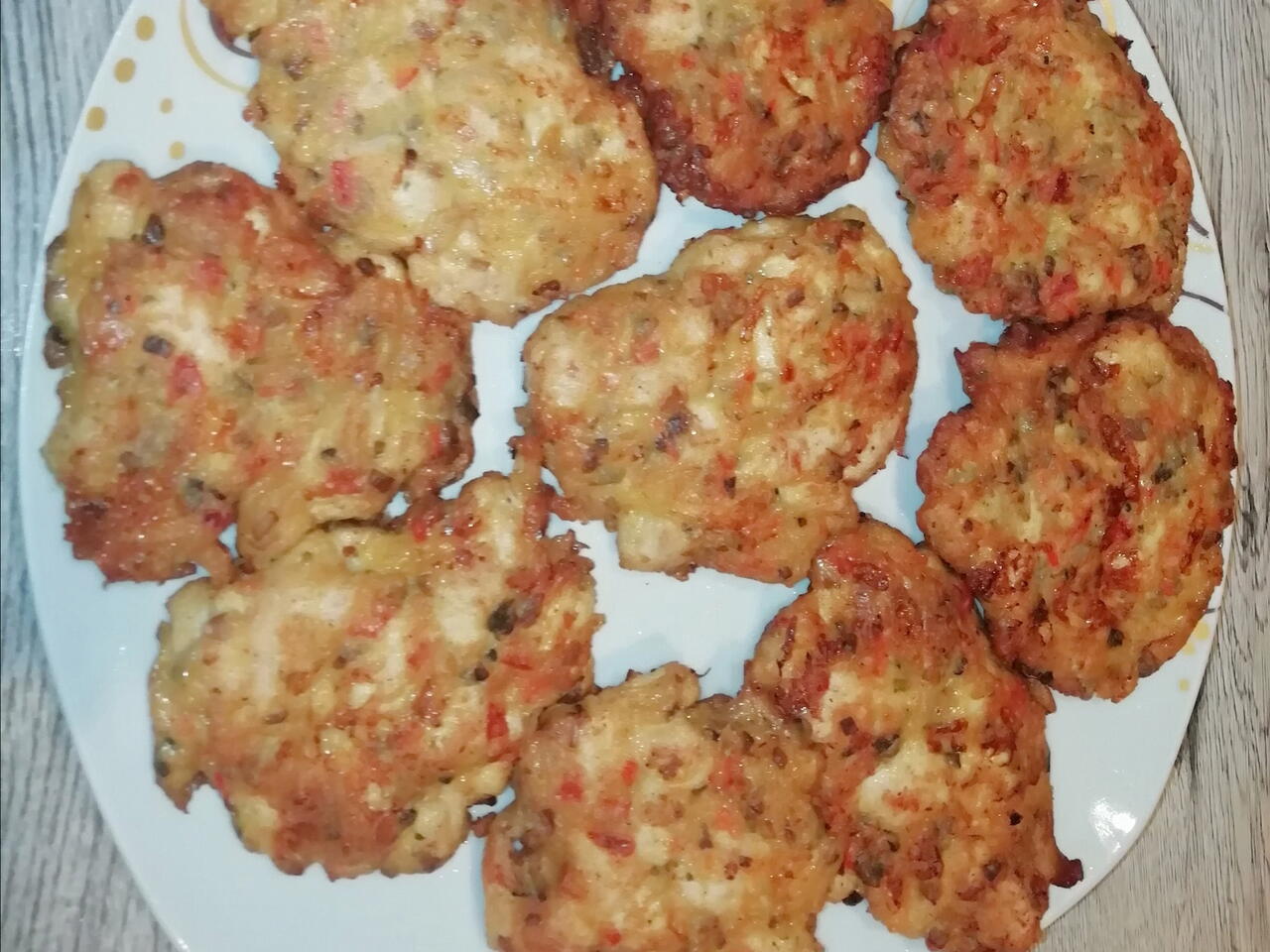Jajka roztrzepać, dodać majonez, mąkę, ser, pierś oraz zawartość patelni. Doprawić do smaku i smażyć nieduże placki. Można podawać na różne sposoby- na obiad z ziemniakami czy ryżem lub jako przekąskę podczas imprezy🙂