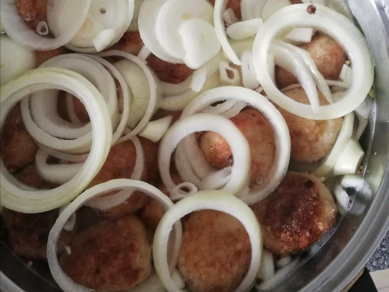 Zalewa : wodę, ocet, cukier, 1 łyżeczkę soli, liście laurowe ziele angielskie i Gorczyce wymieszać w garnku. Usmażone kuleczki włożyć do zalewy. Przykryć pokrojoną w krążki cebulą (2szt)