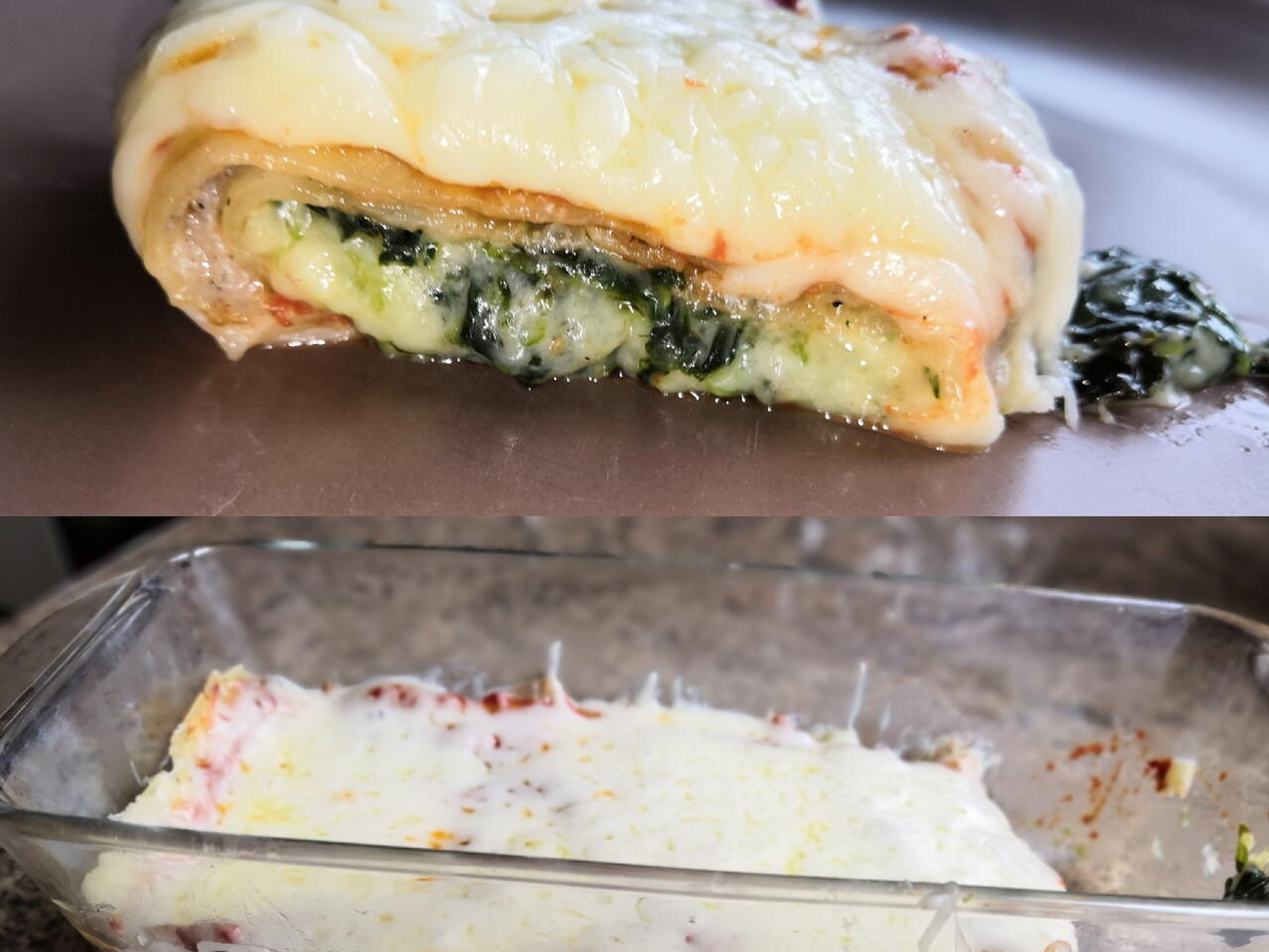 Kiedy mamy wszystko gotowe wykladamy naczynie pokolei makaron, warstwa szpinakowa, makaron, bezszamel, Koncentrat pomidorowy, ser mozzarella. Pieczemy pod przykryciem w 200 stopniach do momentu aż makaron całkiem zmięknie i ser się rozpuści.