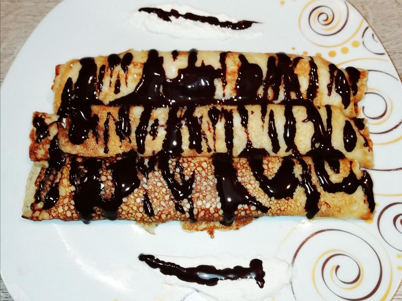 Gotowe naleśniki smarujemy masą i zawijamy w rulonik lub jak kto woli, polewamy czekoladą (przed polaniem można je jeszcze obsmażyć z obu stron). Smacznego 😊
