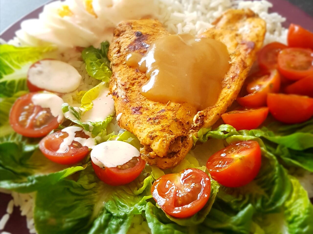 Układasz na talerzu . Ryż sałata pomidorki obok jajko na środku dwa kawałki piersi salatke i jajko polej sosem jogutowym, a mięso pieczeniowym.