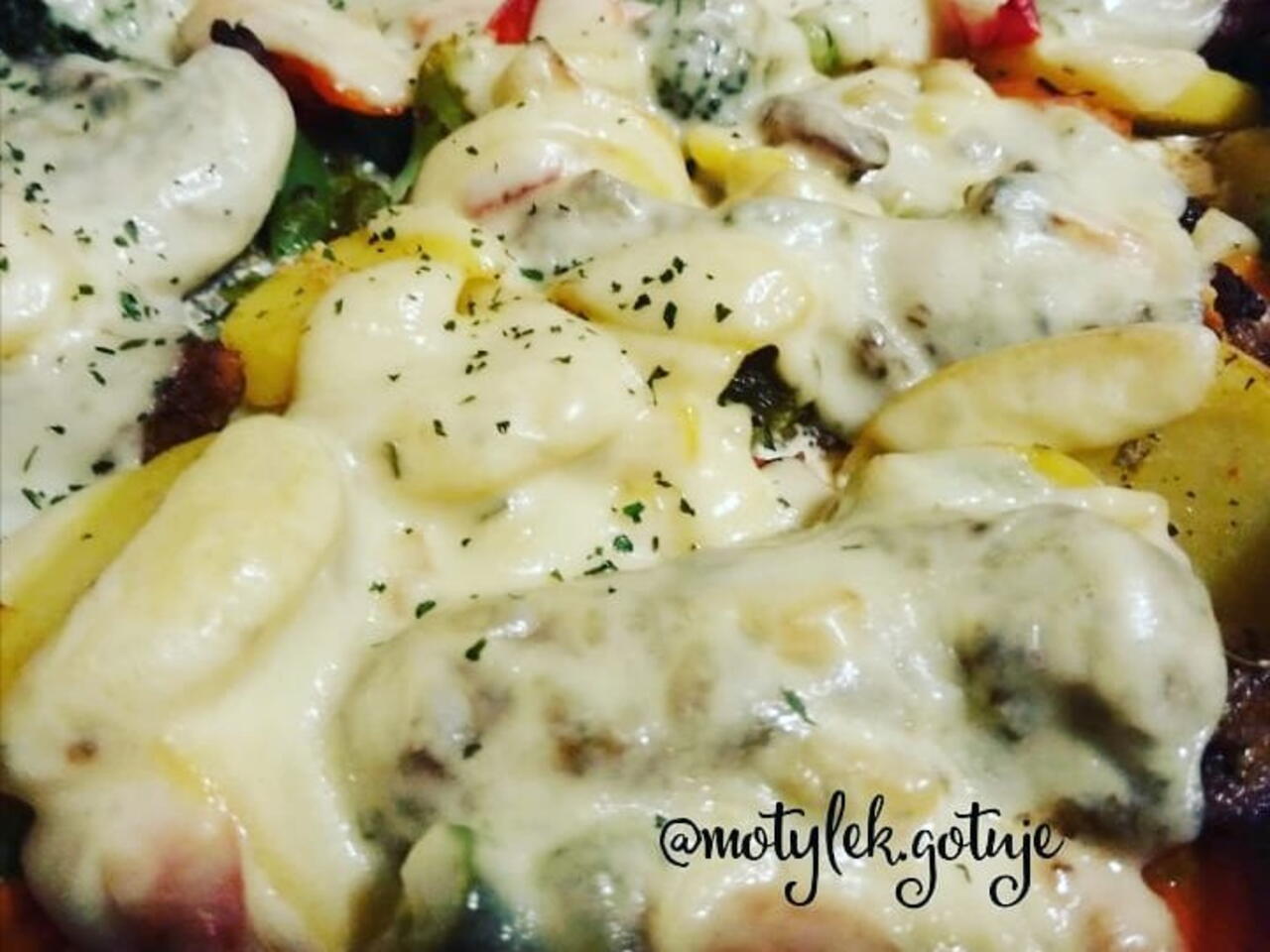Z wywaru+śmietany z mąką oraz natką pietruszki i pieprzem zrobić sos. Doprawić. Na blasze wykładamy warzywa, układamy usmażone polędwiczki i zalewamy sosem. Pieczemy 180 st. 30 min. Przed końcem pieczenia wykładamy set żółty. Posypujemy natką.